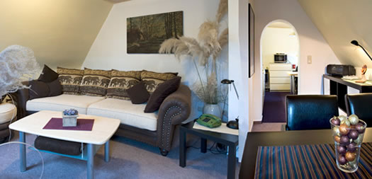 Ruhiges Appartement ca.50 qm. Modern und komfortabel mit 18 qm Dachterasse. Möbl. Schlafzimmer mit 2 m Doppelbett (Komforthöhe) o. 2 Einzelb. m. elektr. Lattenrost.